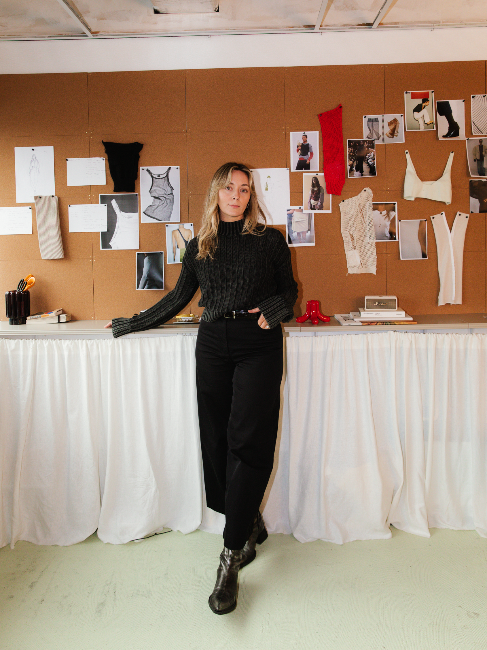 My studio holds an extensive archive of knit-downs, yarn books, colour references, and samples built over more than a decade in industry, allowing me to work remotely at a senior level when required.